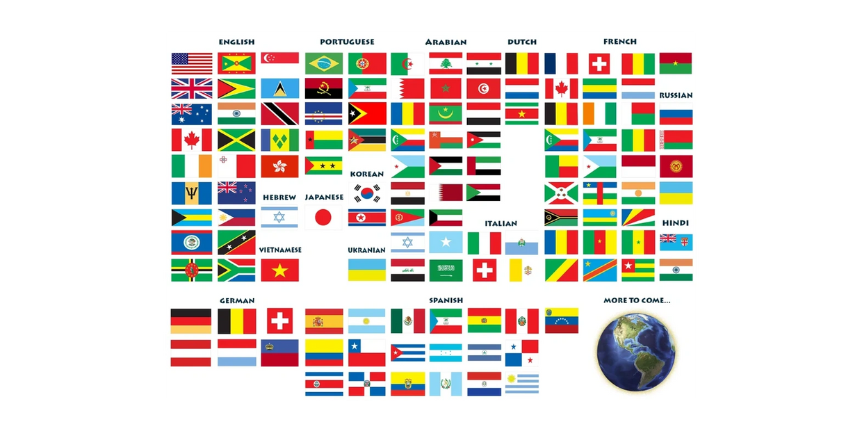 Arabic, Dutch, English, French, German, Hebrew, Hindi, Indonesian, Italian, Japanese, Korean, Portuguese, Russian, Spanish, Turkish, Ukrainian, and Vietnamese.